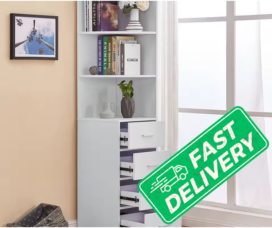 Drawers & 3-Tier Shelf Floor Standing Cabinet: This spacious tall corner cabinet features three open shelves and 4 storage drawers for a variety of storage and display options, elegant white colour suitable for most of home decor