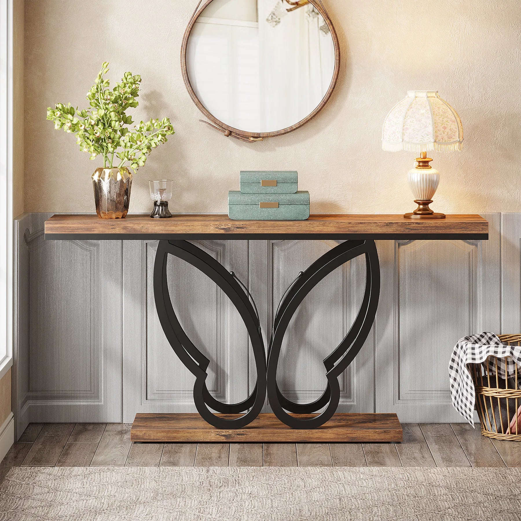 Distinguished Craftsmanship Impeccably designed, this console sofa table features two brown wooden planks, between which a beautiful butterfly metal frame is crafted artfully. It adds rich character to your home with its unique appeal and promises enduring reliability due to its sturdy construction.