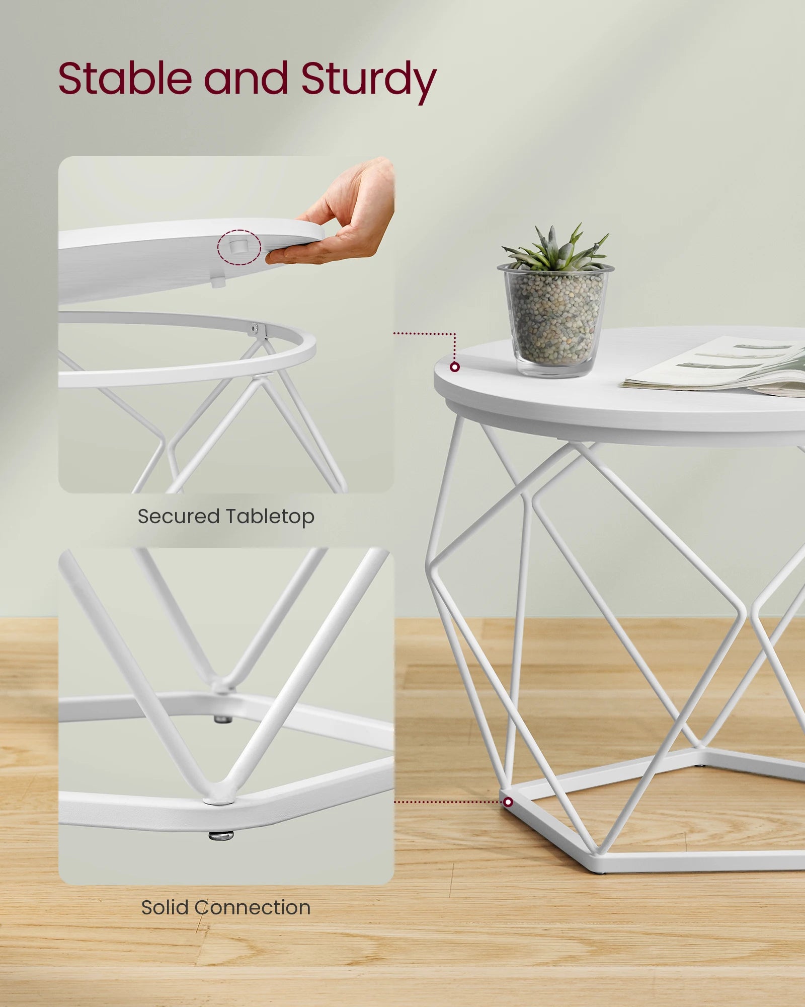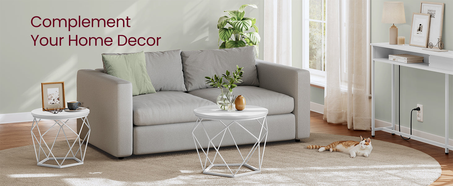 The geometric cloud white steel base paired with a snow-white round surface delivers striking industrial aesthetics. Deploy them as a unified display in your lounge, or position individually throughout your home—beside sofas, in bedrooms, or as workspace surfaces.