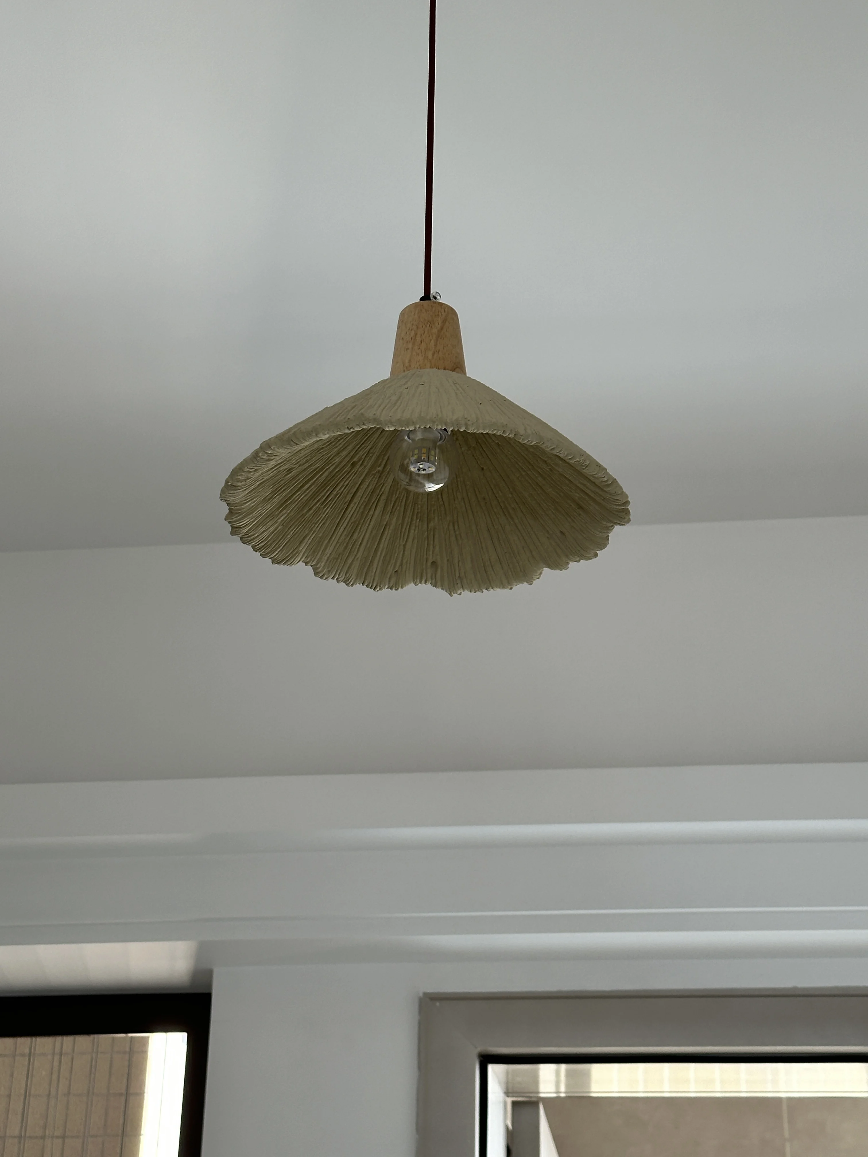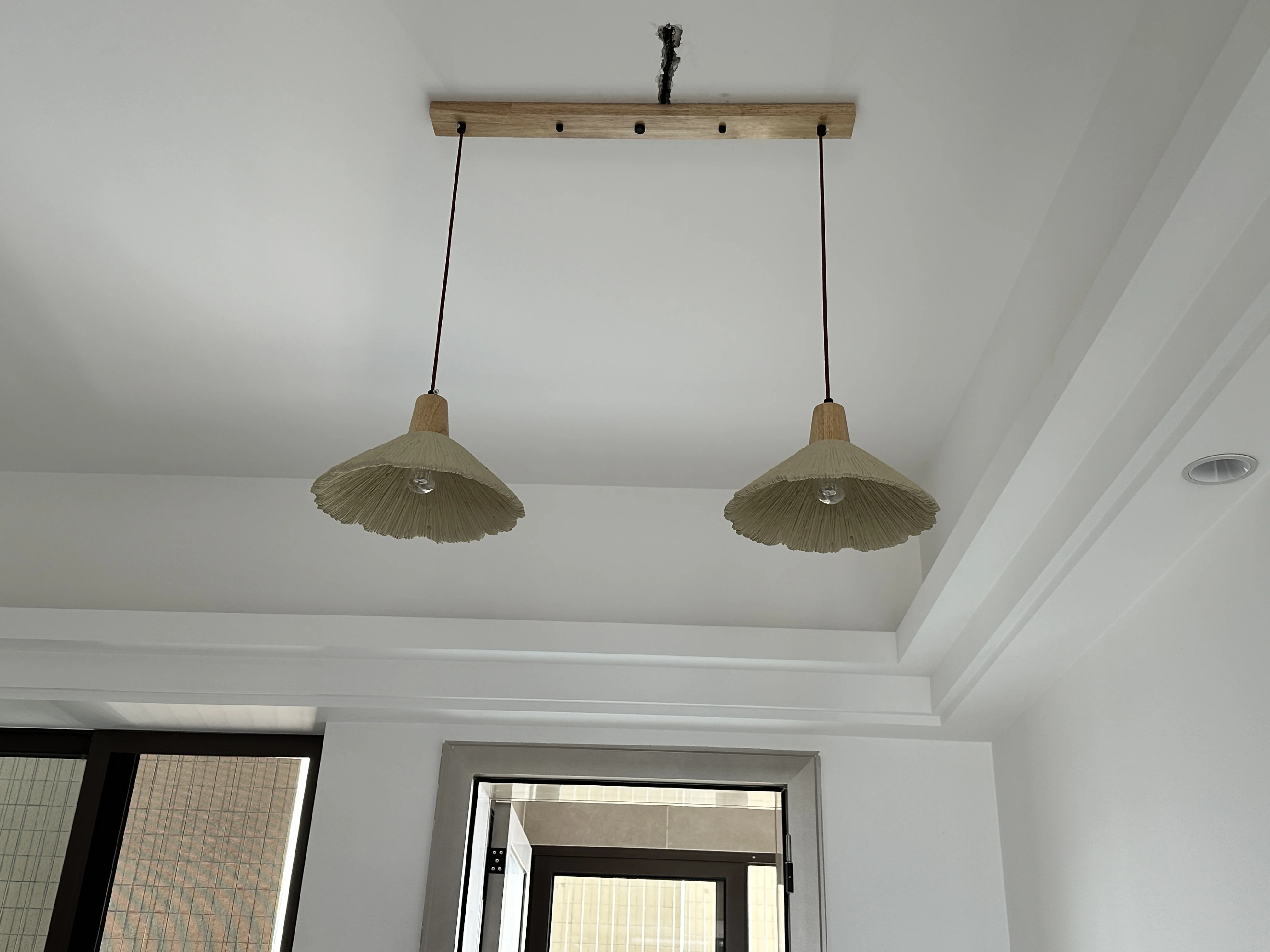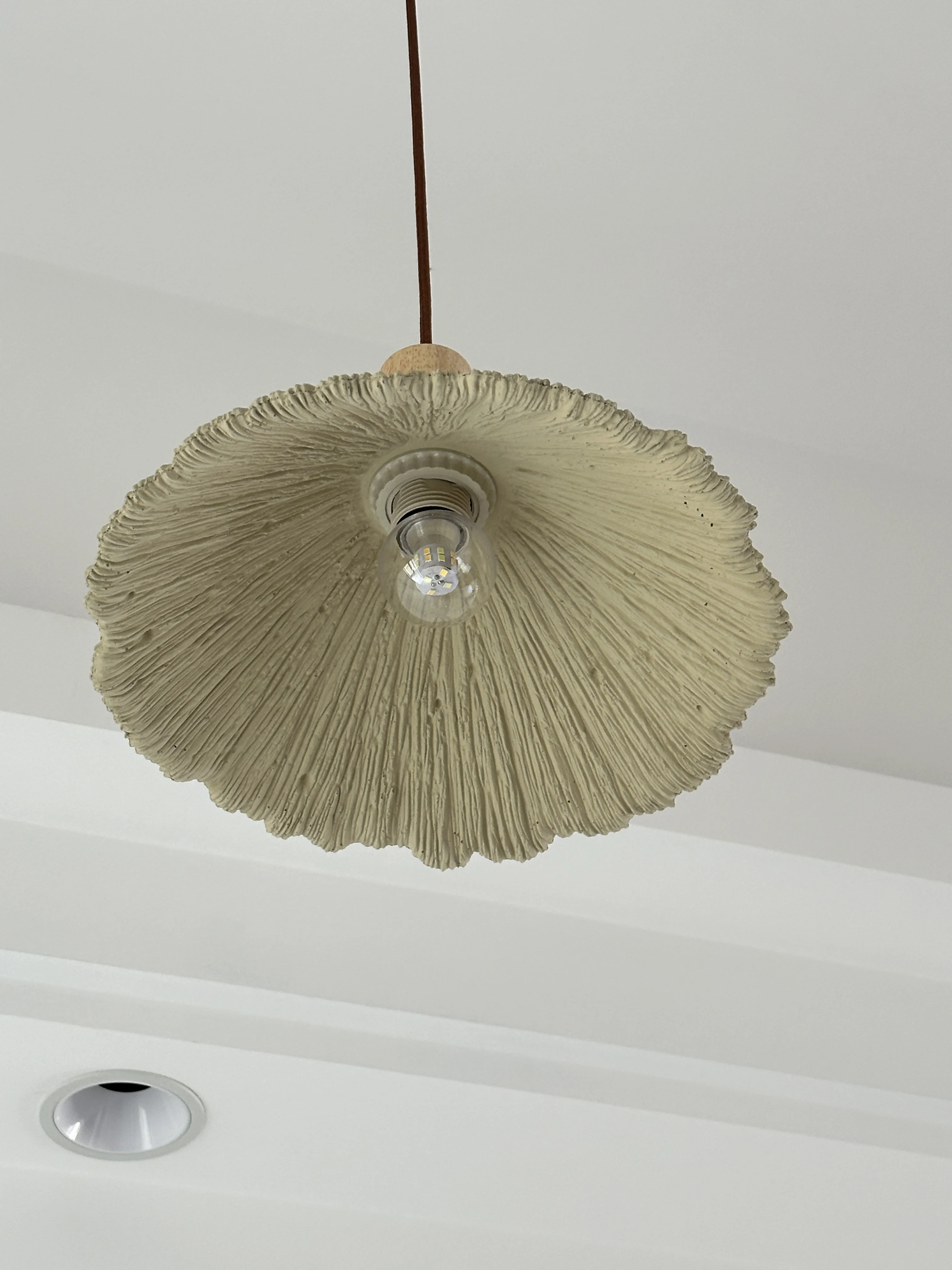 This is a super beautiful chandelier. It looks great whether the light is on or off. The height can be adjusted and it can be customized according to our requirements. The texture is good and the workmanship is fine. It's good value for money and very suitable for my home scene. It's a plus. The cement lampshade has a very good texture. I love it